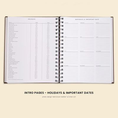 • Intro planner pages include full year overview, yearly vision, holidays and important dates.