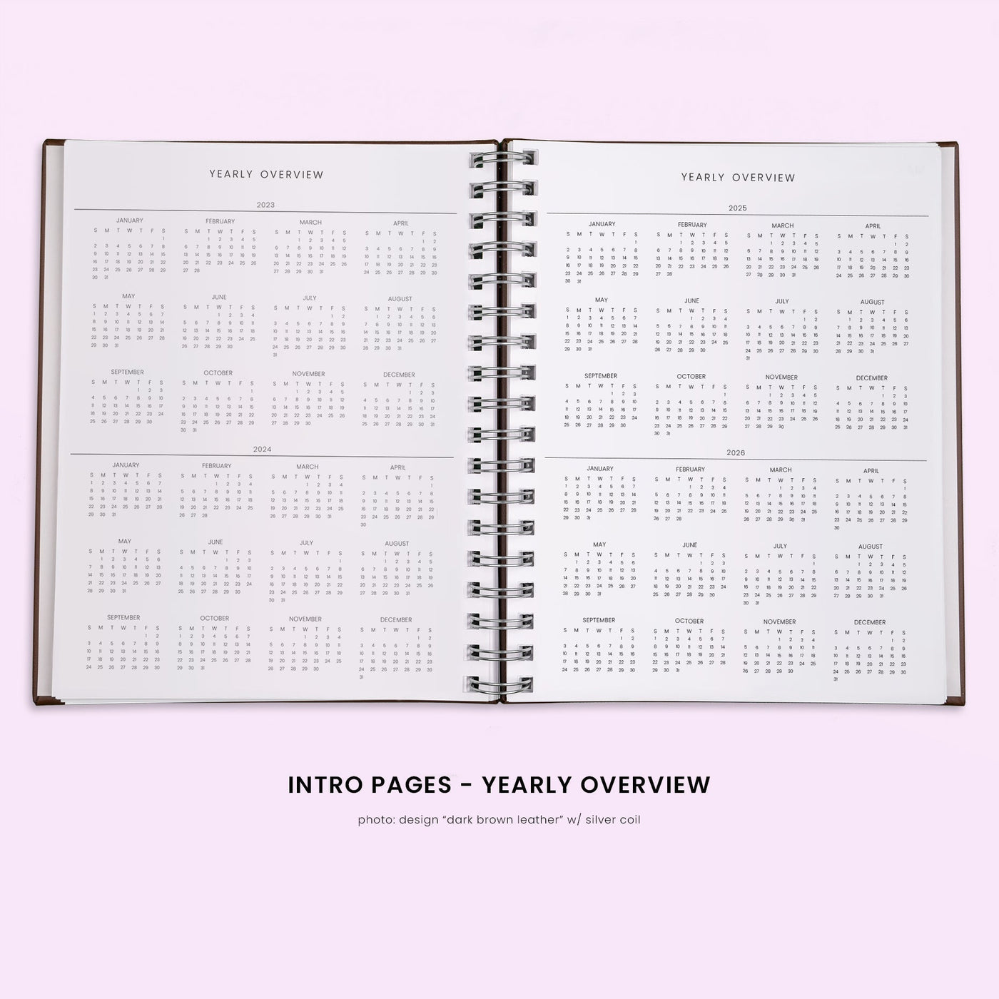 • Intro planner pages include full year overview, yearly vision, holidays and important dates.